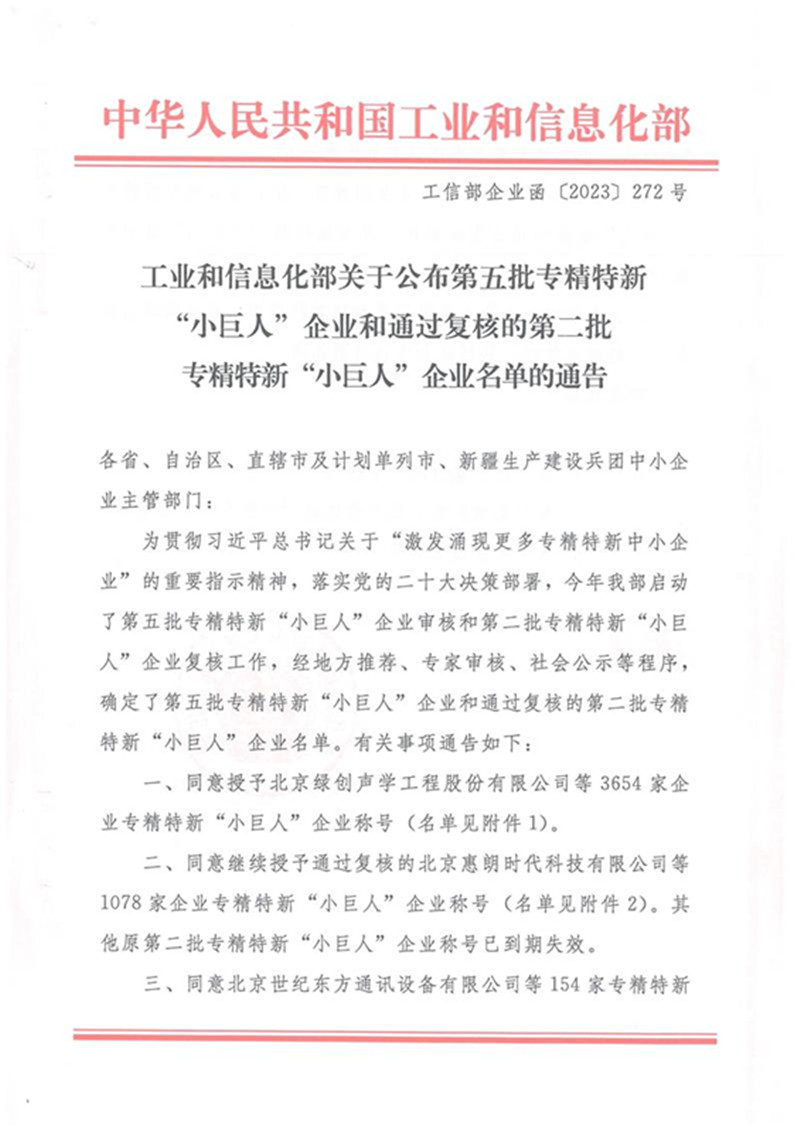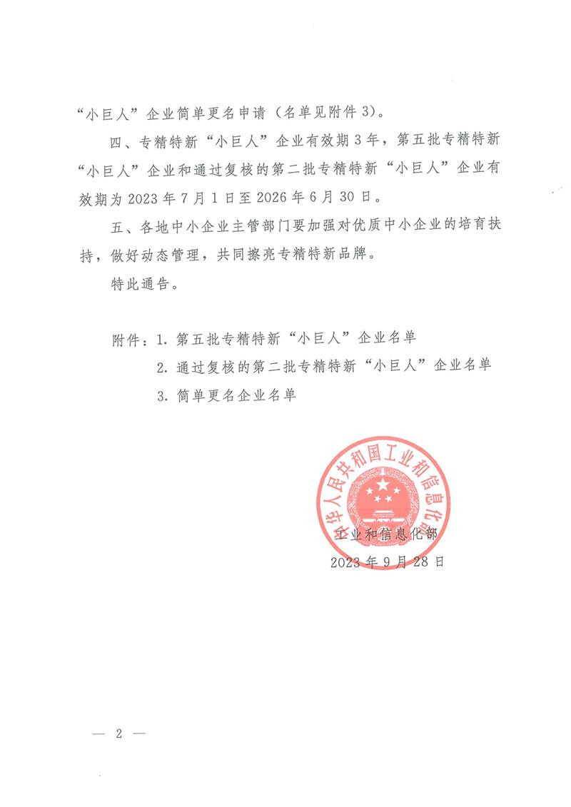為貫徹習(xí)近平總書(shū)記關(guān)于“激發(fā)涌現(xiàn)更多專(zhuān)精特新中小企業(yè)”的重要指示精神,落實(shí)黨的二十大決策部署,工業(yè)和信息化部啟動(dòng)了第五批專(zhuān)精特新“小巨人”企業(yè)審核的工作,我公司榮獲第五批專(zhuān)精特新“小巨人”稱(chēng)號(hào)。
